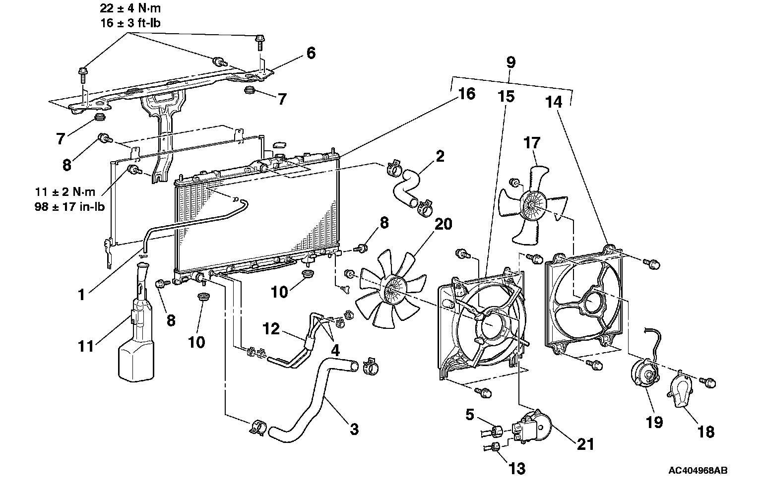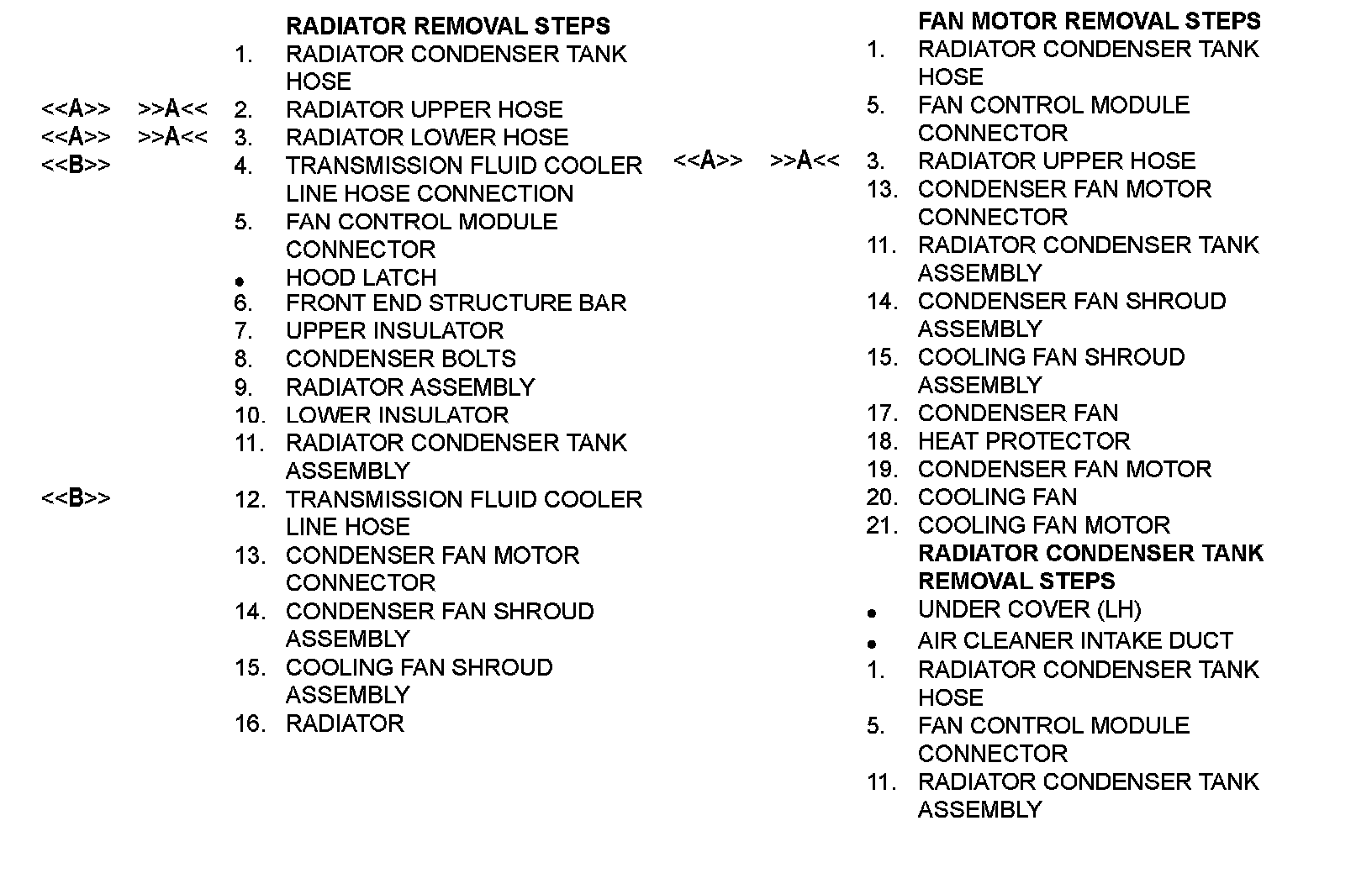 Fan Motor, Radiator Condenser Tank Removal Steps 15-17, 1-11: