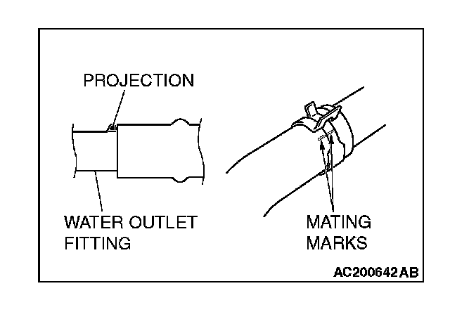 Make mating marks on the radiator hose and the hose clamp. Disconnect the radiator hose.