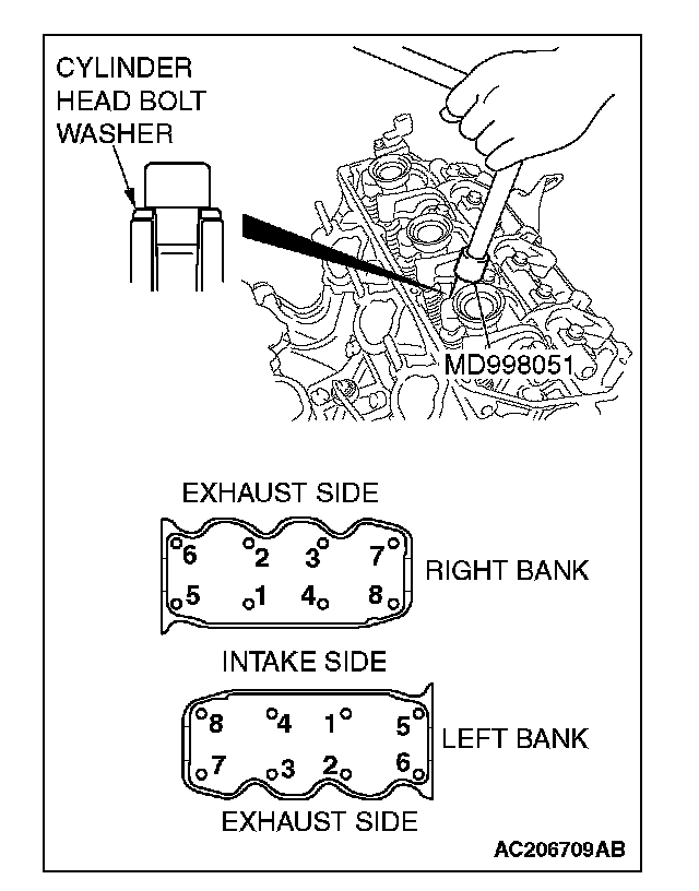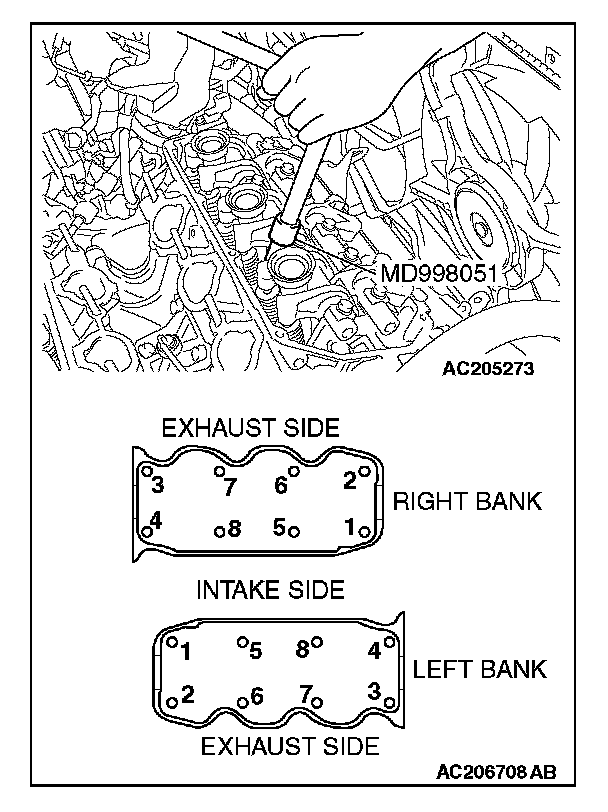 Use special tool MD998051 to loosen each bolt in two or three steps in the order shown in the illustration.