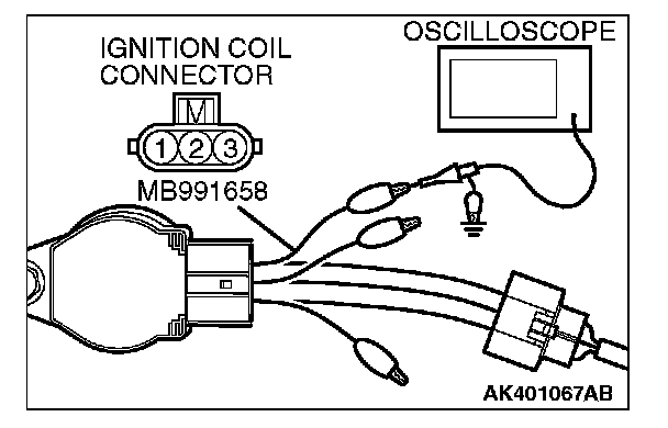 1. Disconnect the ignition coil connector, and connect test harness special tool (MB991658) between the separated connector. (All terminals should be connected.)