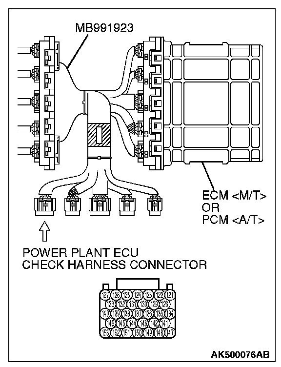 1. Disconnect all ECM [M/T] connectors or PCM [A/T] connectors. Connect the check harness special tool (MB991923) between the separated connectors.