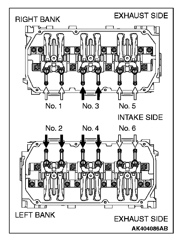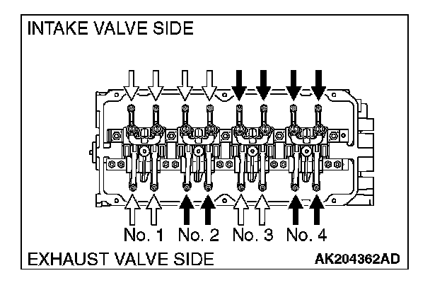 5. Valve clearance inspection and adjustment can be performed on rocker arms indicated by white arrow mark when the No. 1 cylinder piston is at the top dead center on the compression stroke, and on rocker arms indicated by black arrow mark when the No.4 cylinder piston is at the top dead center on the compression stroke.