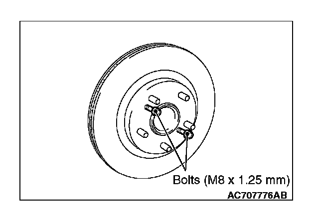 If the rear brake disk removal is difficult, install bolts (M8 x 1.25 mm) shown in the figure, and tighten them evenly and gradually to remove the rear brake disk.