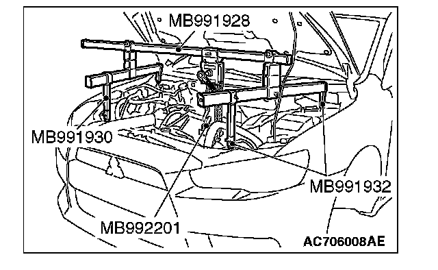 1) Set the feet of the engine mechanical hanger (special tool MB991895) as shown in the figure.
