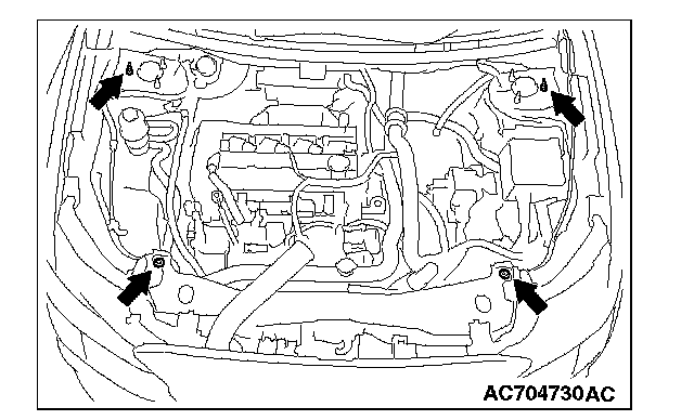 3) Set the chain to the engine hanger plate (Special tool: MB992201), to support the engine and transaxle assembly. Remove the garage jack, and then remove the transaxle assembly upper part coupling bolts that have been loosened previously.
