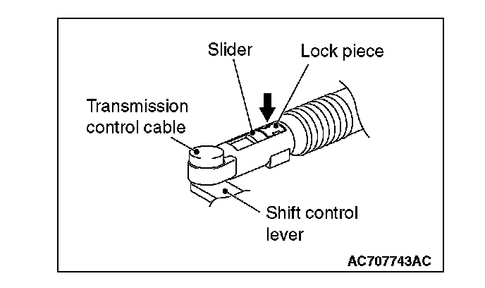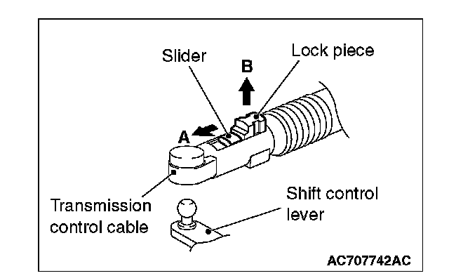 3. Move the slider of the transaxle control cable (transaxle side) tip to the direction A to pull up the lock piece to the direction B.