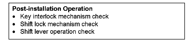 CAUTION: When the transaxle control cable is disconnected, check after the installation that the cable is properly connected, and that the parking lock mechanism operates normally. At this time, do not check by simply using the display on the combination meter and shift indicator panel. Always check according to the procedure below.