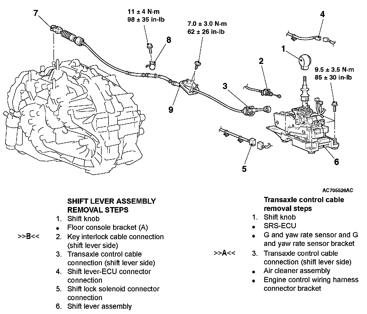 Shift Lever Removal Steps 1-6, Transaxle Control Cable Removal Steps 1-3: