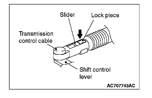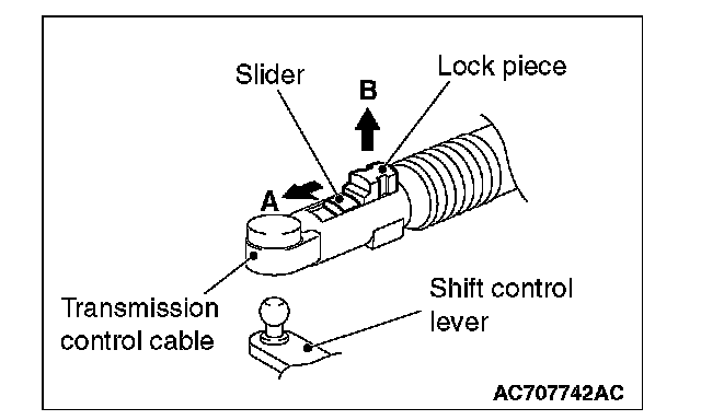 4. Move the slider of the transaxle control cable (transaxle side) tip to the direction A to pull up the lock piece to the direction B.