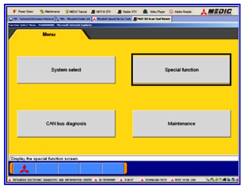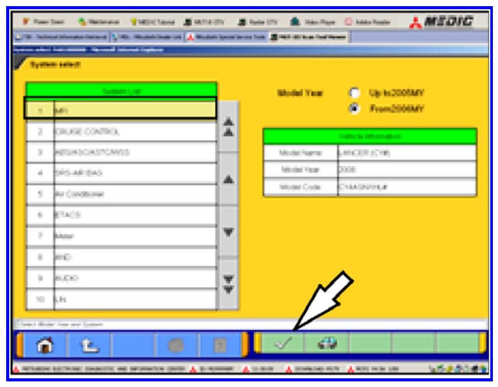 1. Connect MUT-III to the vehicle and turn the ignition switch to ON (RUN).2. At the MUT-III main menu, choose System Select.