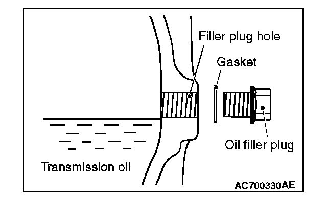4. Remove the oil filler plug and gasket, then fill the oil up to the lower edge of the oil filler plug.