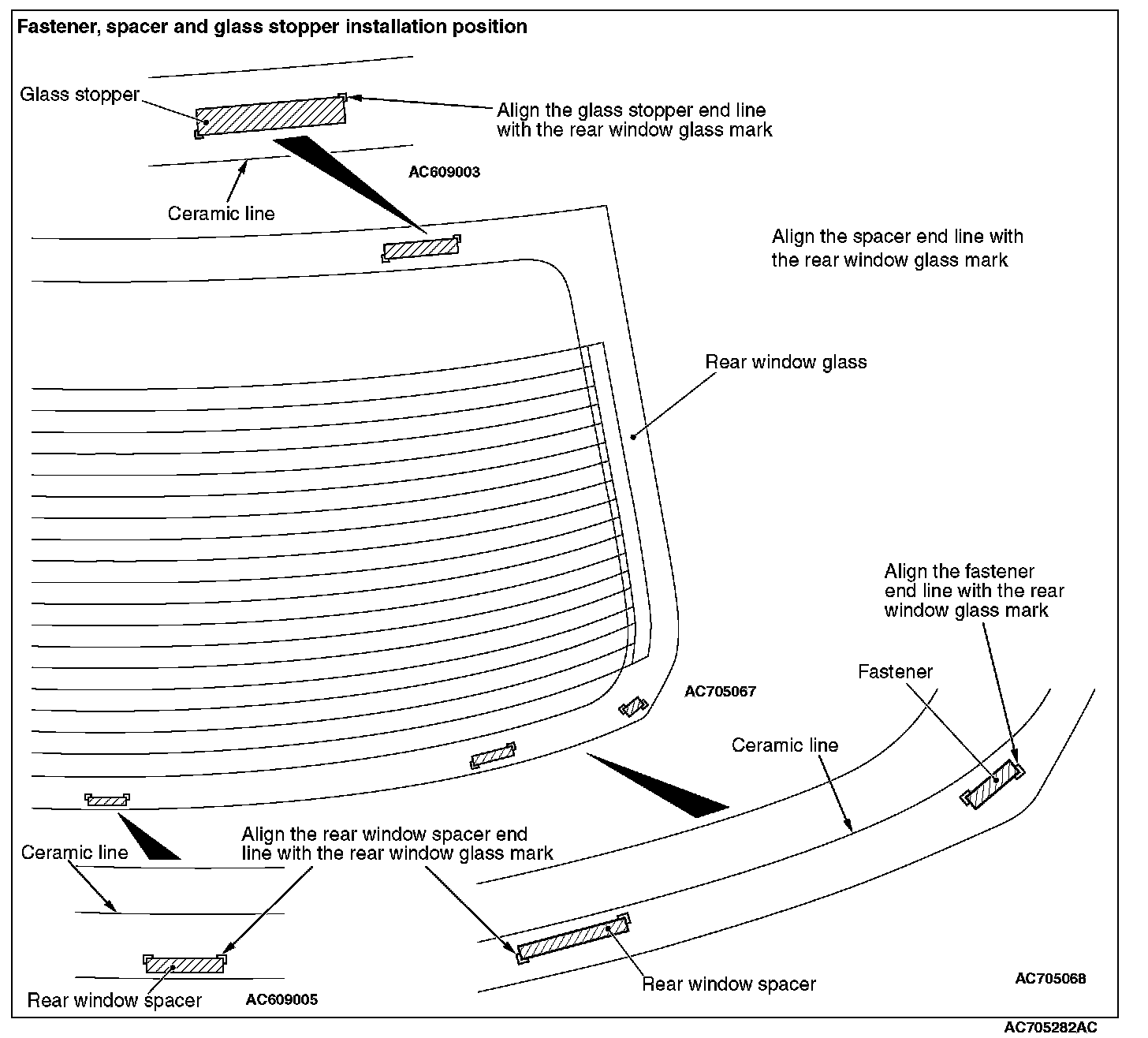 2. Install the fastener, rear window spacers, and glass stoppers to the specified positions so that there are no adrift or warped surfaces inside the rear window glass.