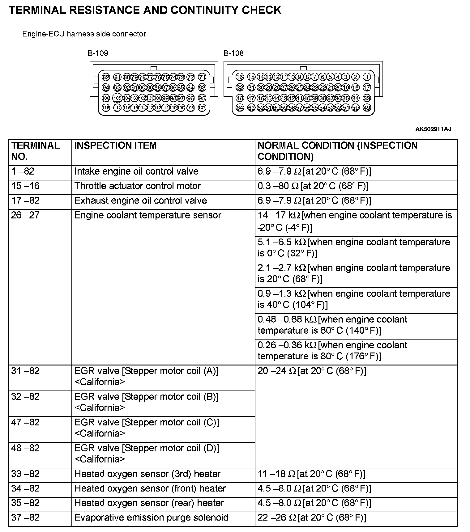 CHECK AT THE ENGINE CONTROL MODULE (ECM)1. Disconnect the ECM connectors B-108 and B-109, and connect check harness special tool MB992110 between the ECM connectors.