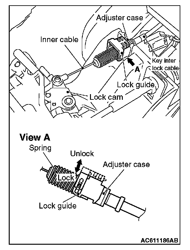 3) Install the tip of the key interlock cable to the lock cam of the selector lever assembly, taking care not to twist the inner cable.