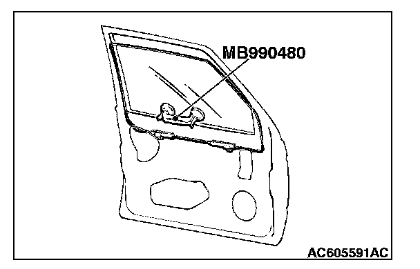 CAUTION: If tinting film is adhered to the door window glass, attach special tool MB990480 to the outside of the glass to prevent the film from peeling off.