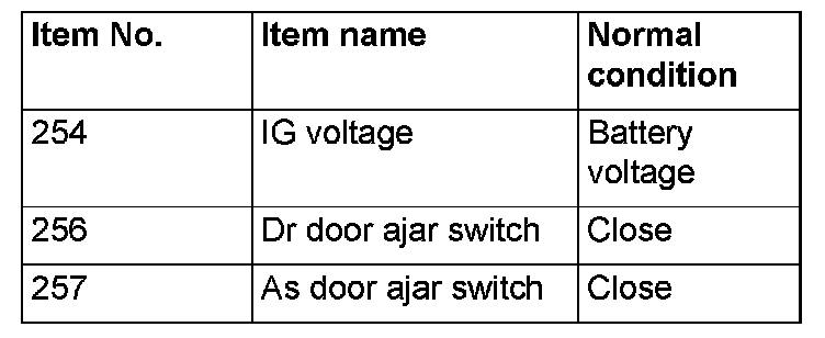 NO (Normal condition is not displayed for item No. 257.) : Refer to Chassis Electrical - inspection procedure 6: the front door switch (passenger's side) signal is not received.