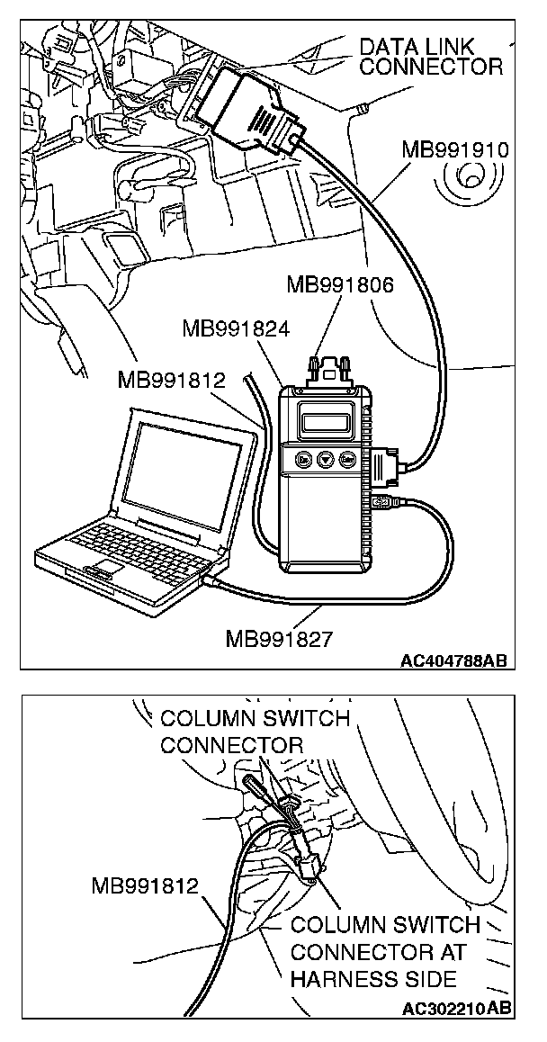 CAUTION: To prevent damage to scan tool MB991958, always turn the ignition switch to the "LOCK" (OFF) position before connecting or disconnecting scan tool MB991958. Connect special tool MB991910 before connecting special tool MB991812. Be sure to connect special tool MB991806 after turning on special tool MB991824.