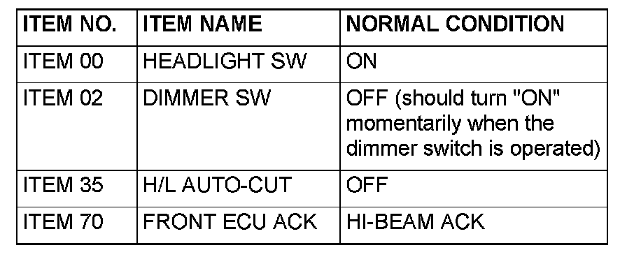 Q: Does the scan tool MB991958 display the items "HEADLIGHT SW", "DIMMER SW", "H/L AUTO-CUT" and "FRONT ECU ACK" as normal condition?