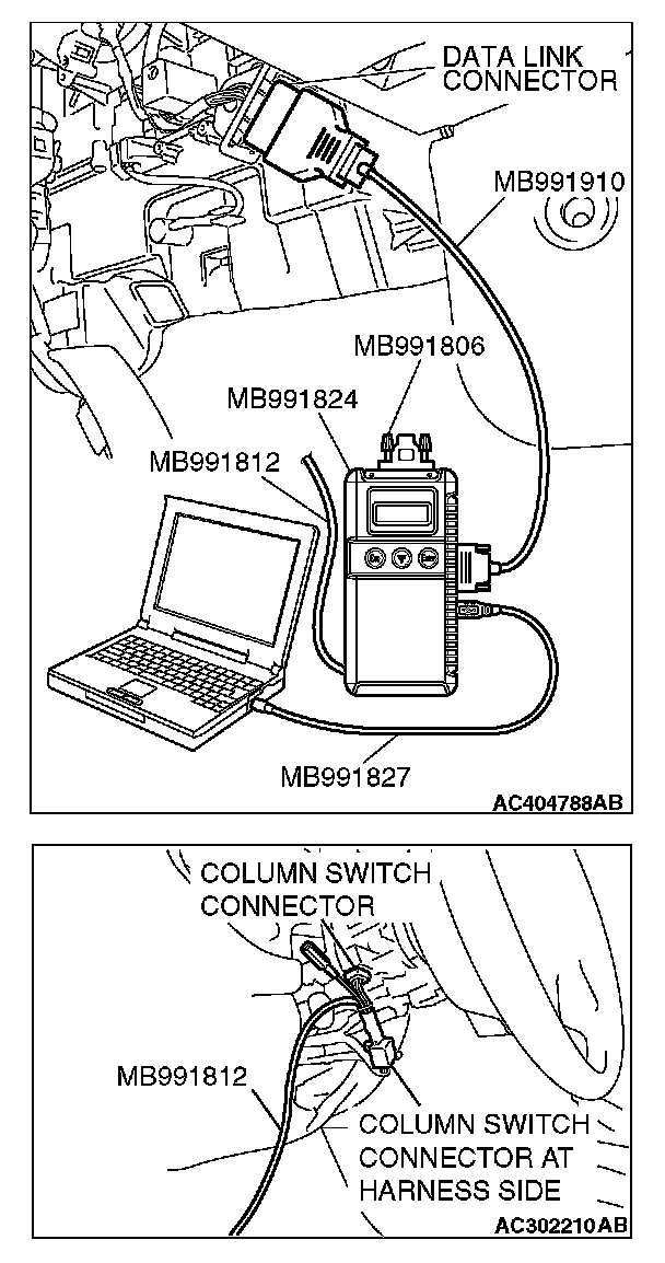 CAUTION: To prevent damage to scan tool MB991958, always turn the ignition switch to the "LOCK" (OFF) position before connecting or disconnecting scan tool MB991958. Connect special tool MB991910 before connecting special tool MB991812. Be sure to connect special tool MB991806 after turning on special tool MB991824.