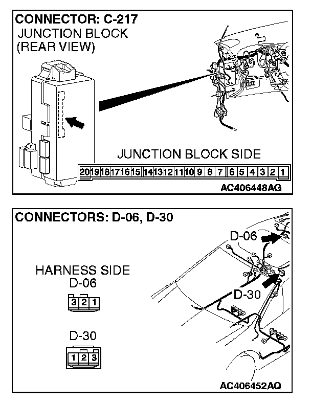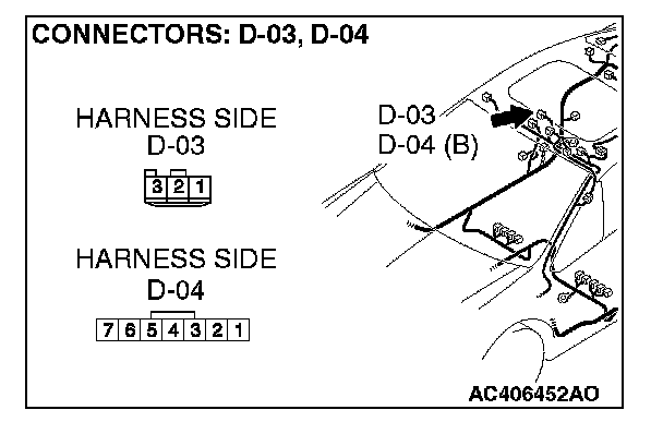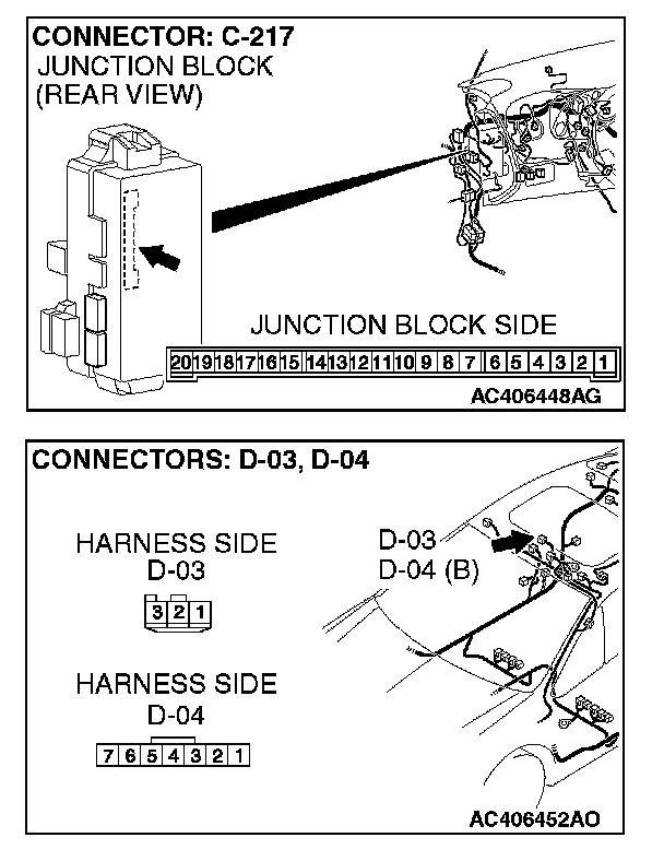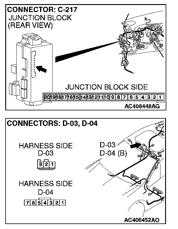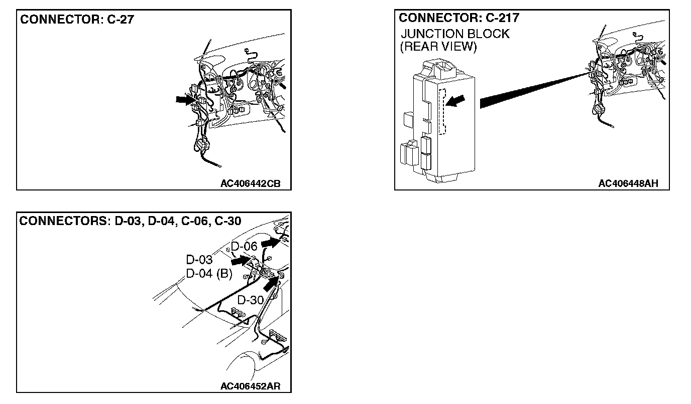 STEP 2. Check front dome light connector D-03 [without sunroof], D-04 [with sunroof] and ETACS-ECU connector C-217 for loose, corroded or damaged terminals, or terminals pushed back in the connector.