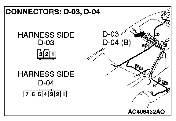 STEP 3. Check the wiring harness between front dome light connector D-03 (terminals 1 and 3) [without sunroof] or D-04 (terminals 6 and 7) [with sunroof] and ETACS-ECU connector C-217 (terminals 5 and 6).