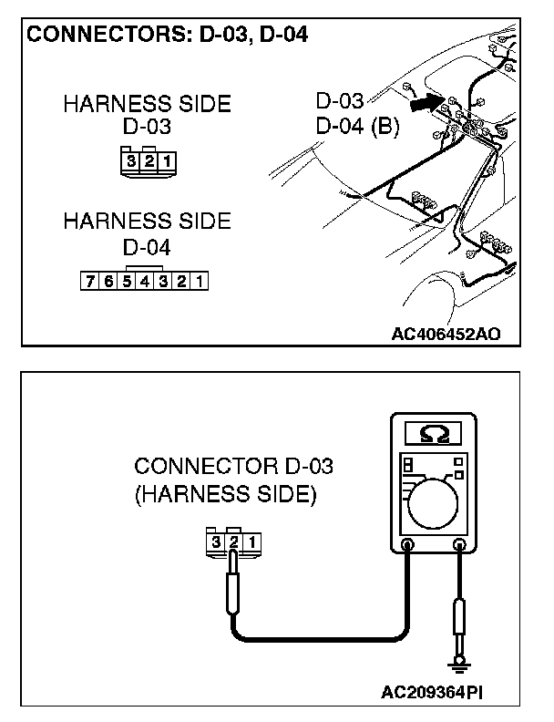 STEP 8. Check the wiring harness between front dome light connector D-03 (terminals 1 and 3) [without sunroof] or D-04 (terminals 6 and 7) [with sunroof] and ETACS-ECU connector C-217 (terminals 5 and 6).