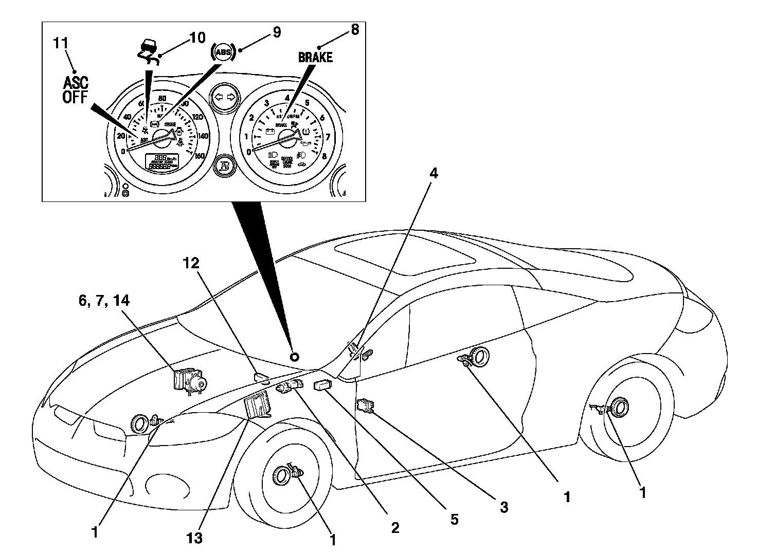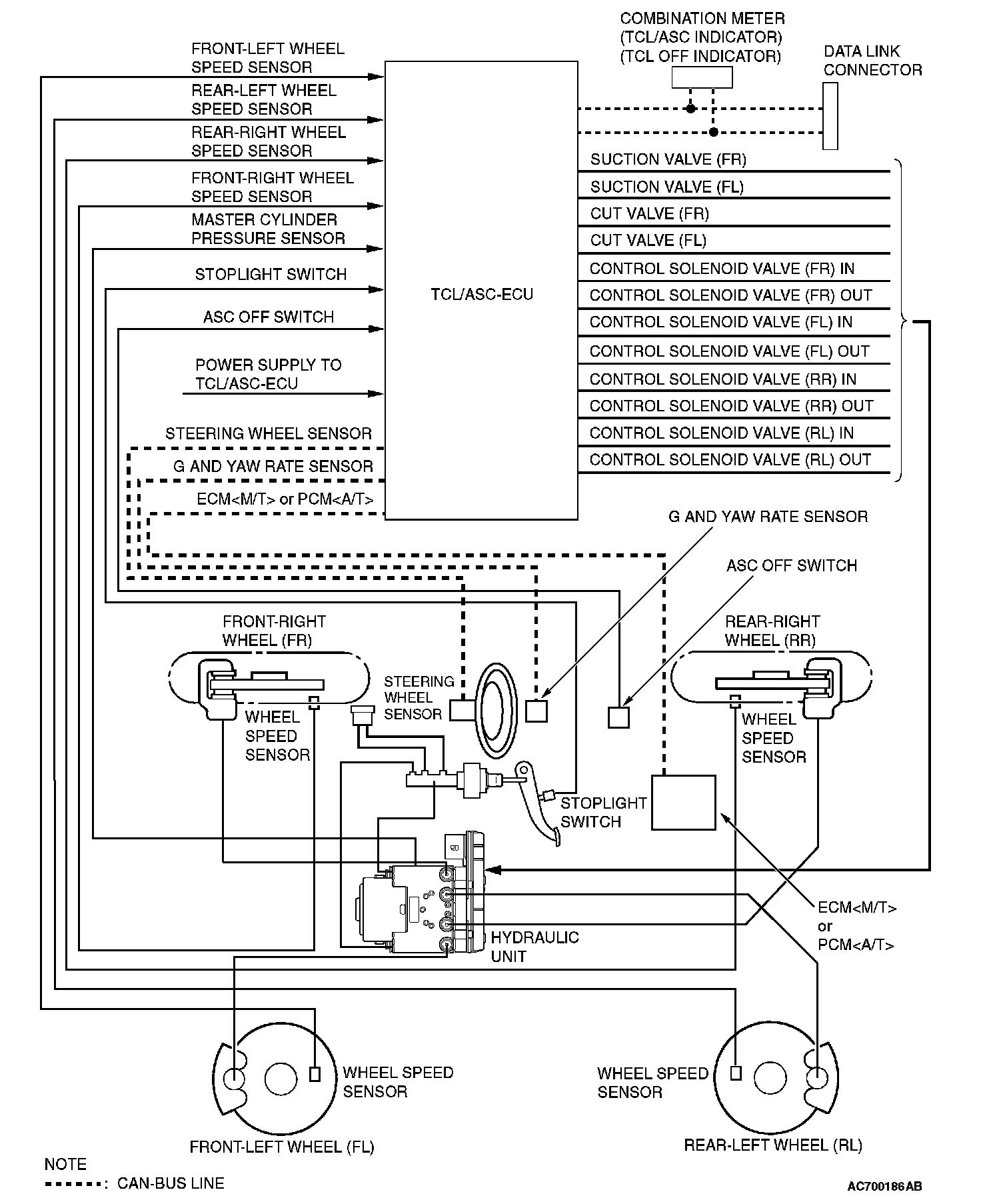 The TCL/ASC is a system that adds a yaw rate sensor, a lateral G sensor, a steering wheel sensor and master cylinder pressure sensor (incorporated in hydraulic unit) to the ABS system.