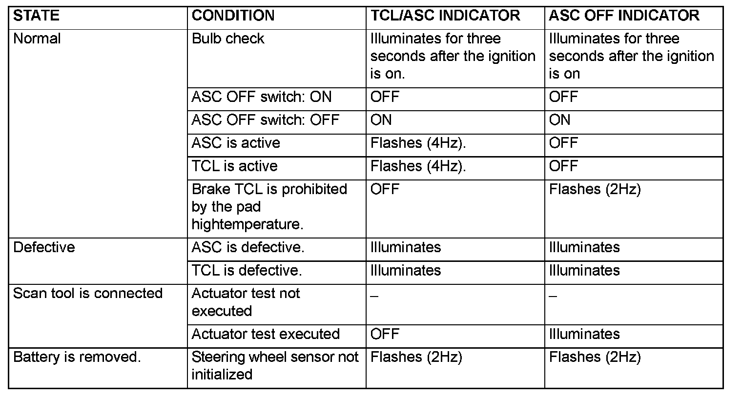 ^ When the brake pad temperature is high, the ASC OFF indicator flashes at a rate of 2 Hz.