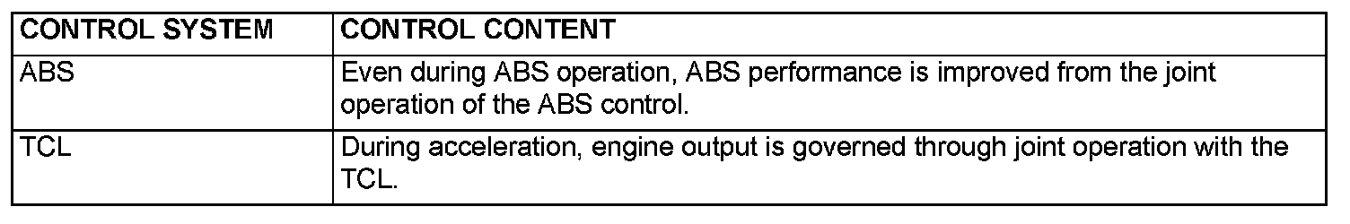 The TCL prevents drive force loss during slipping of the drive wheels by automatically applying the brakes and sending engine torque reduction signal to the ECM [M/T] or PCM [A/T] when the drive wheels slip or when driving on partly low friction surfaces.