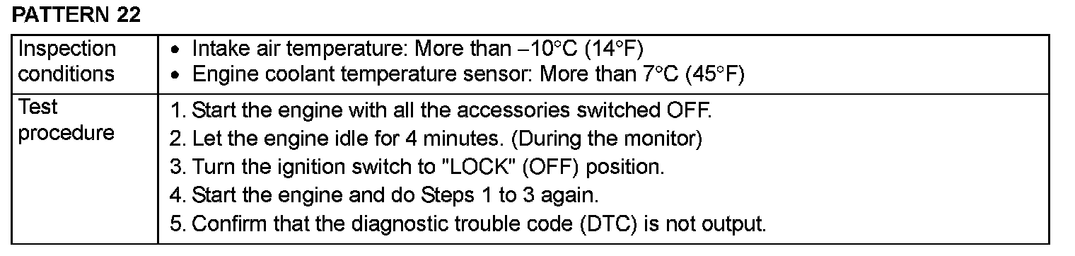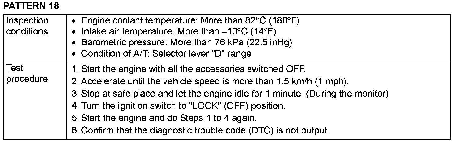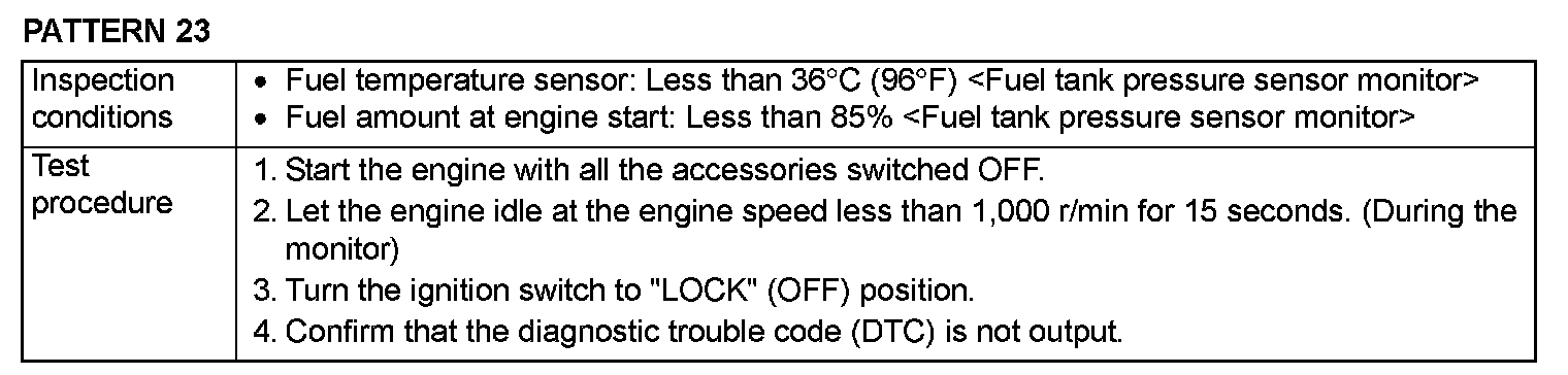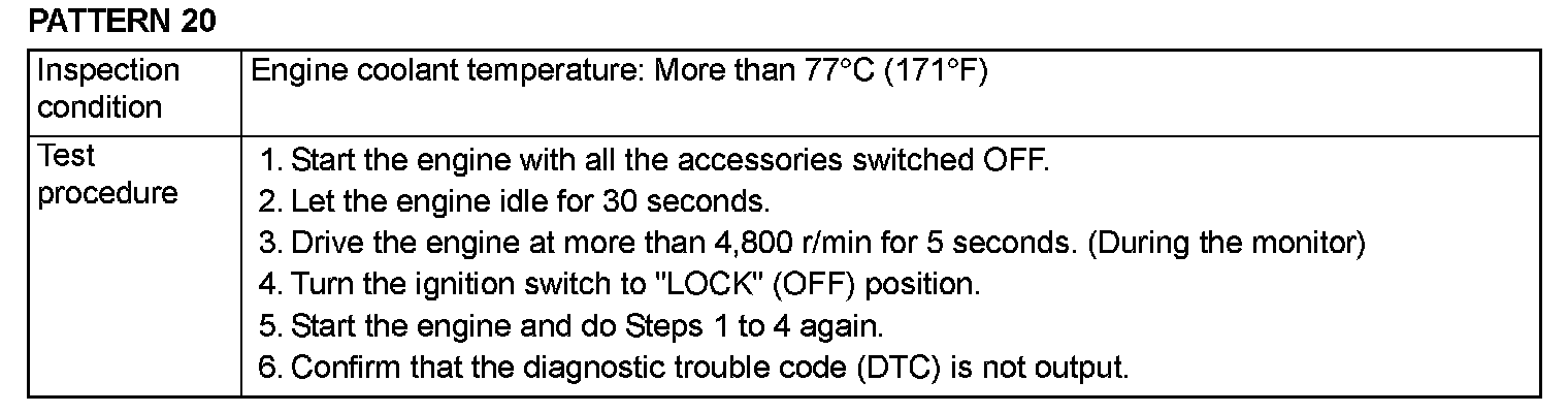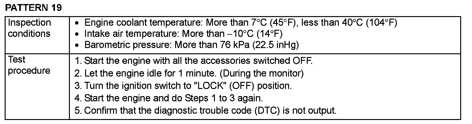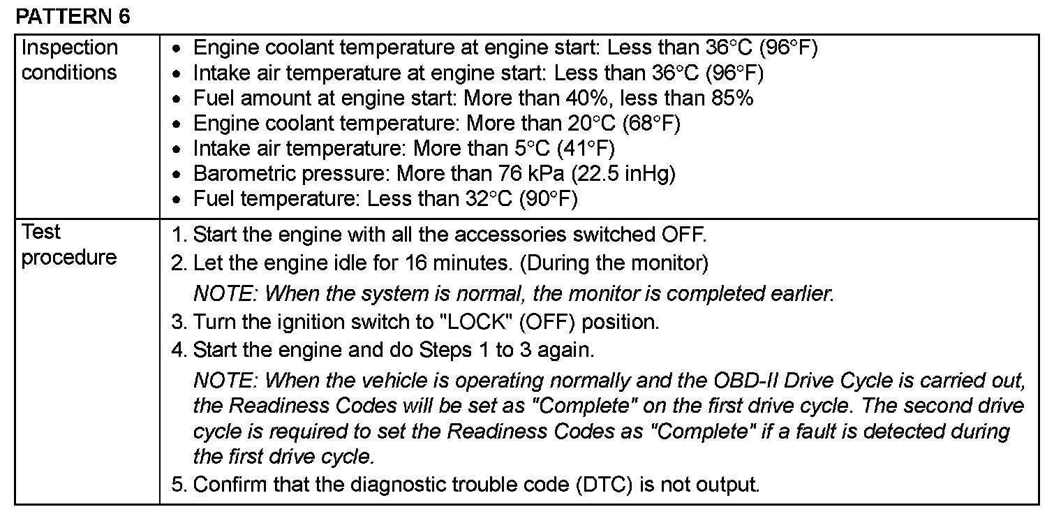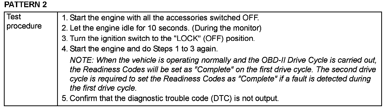 OBD-II DRIVE CYCLEAll kinds of diagnostic trouble codes (DTCs) can be monitored by carrying out a short drive according to the following 23 drive cycle patterns. In other words, doing such a drive regenerates any kind of trouble which involves illuminating the Malfunction Indicator Lamp (SERVICE ENGINE SOON or Check Engine Lamp) and verifies the repair procedure has eliminated [the trouble the Malfunction Indicator Lamp (SERVICE ENGINE SOON or Check Engine Lamp) is no longer illuminated].