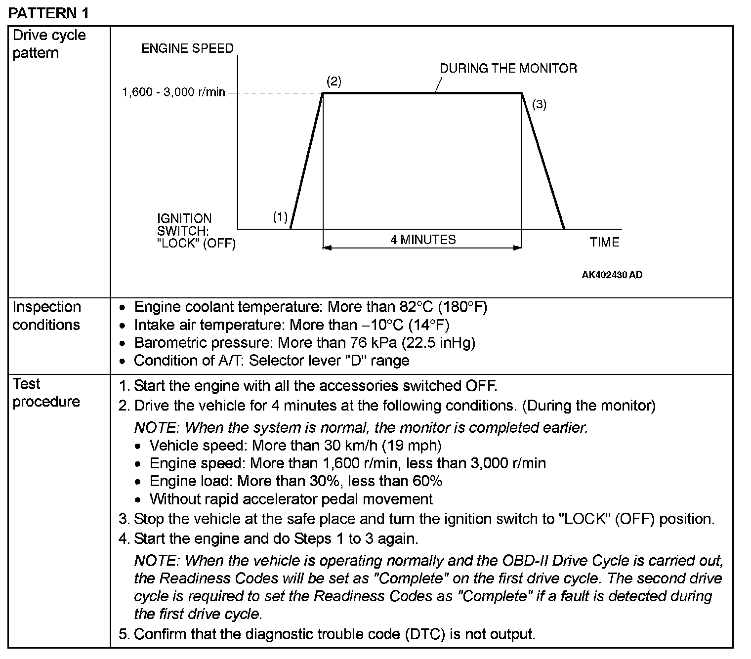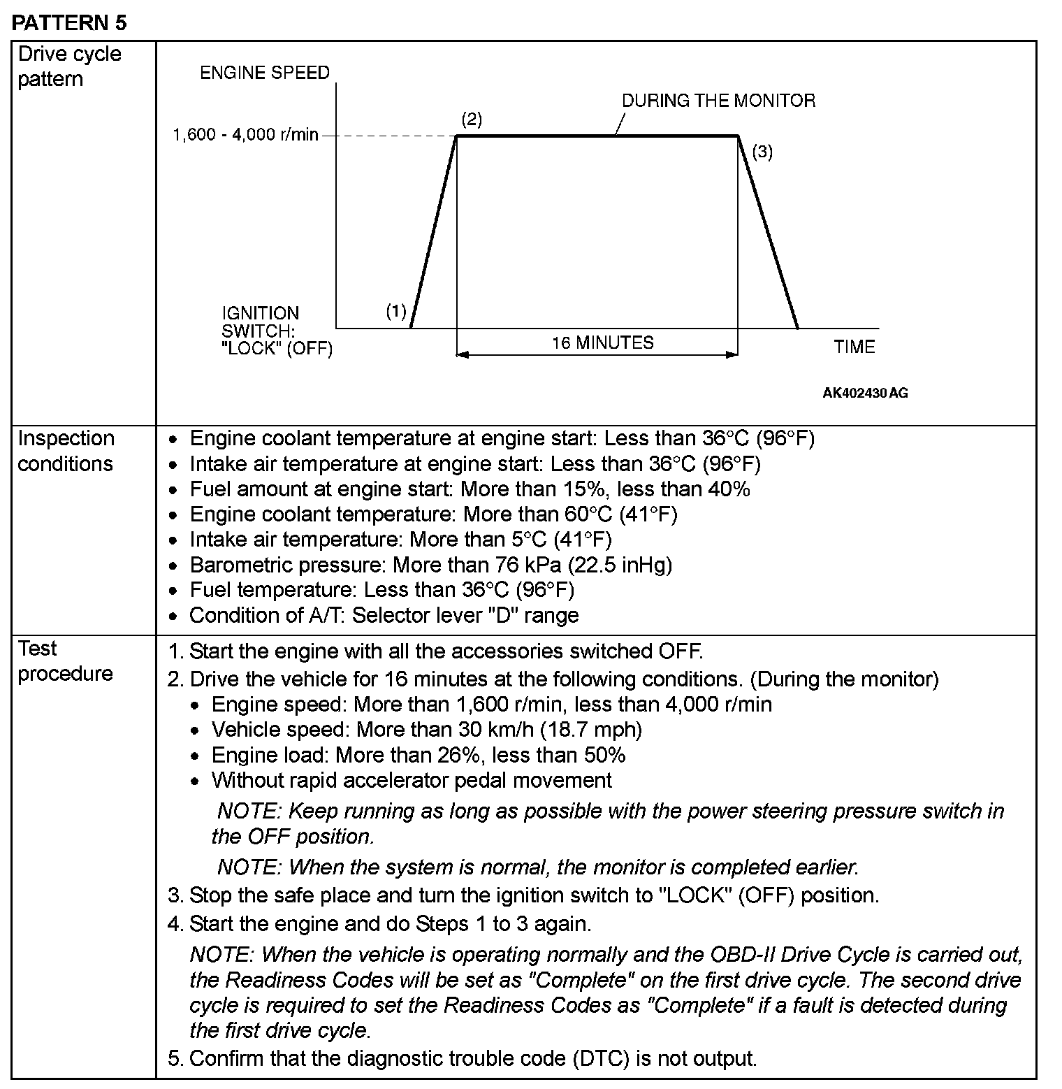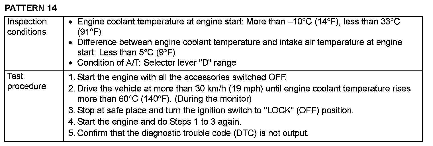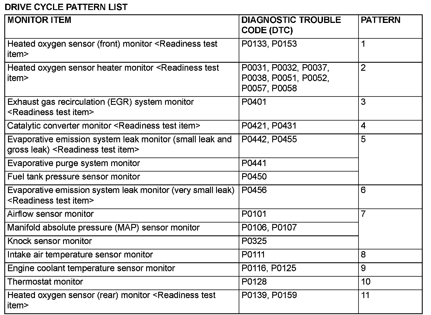 OBD-II DRIVE CYCLEAll kinds of diagnostic trouble codes (DTCs) can be monitored by carrying out a short drive according to the following 23 drive cycle patterns. In other words, doing such a drive regenerates any kind of trouble which involves illuminating the Malfunction Indicator Lamp (SERVICE ENGINE SOON or Check Engine Lamp) and verifies the repair procedure has eliminated [the trouble the Malfunction Indicator Lamp (SERVICE ENGINE SOON or Check Engine Lamp) is no longer illuminated].