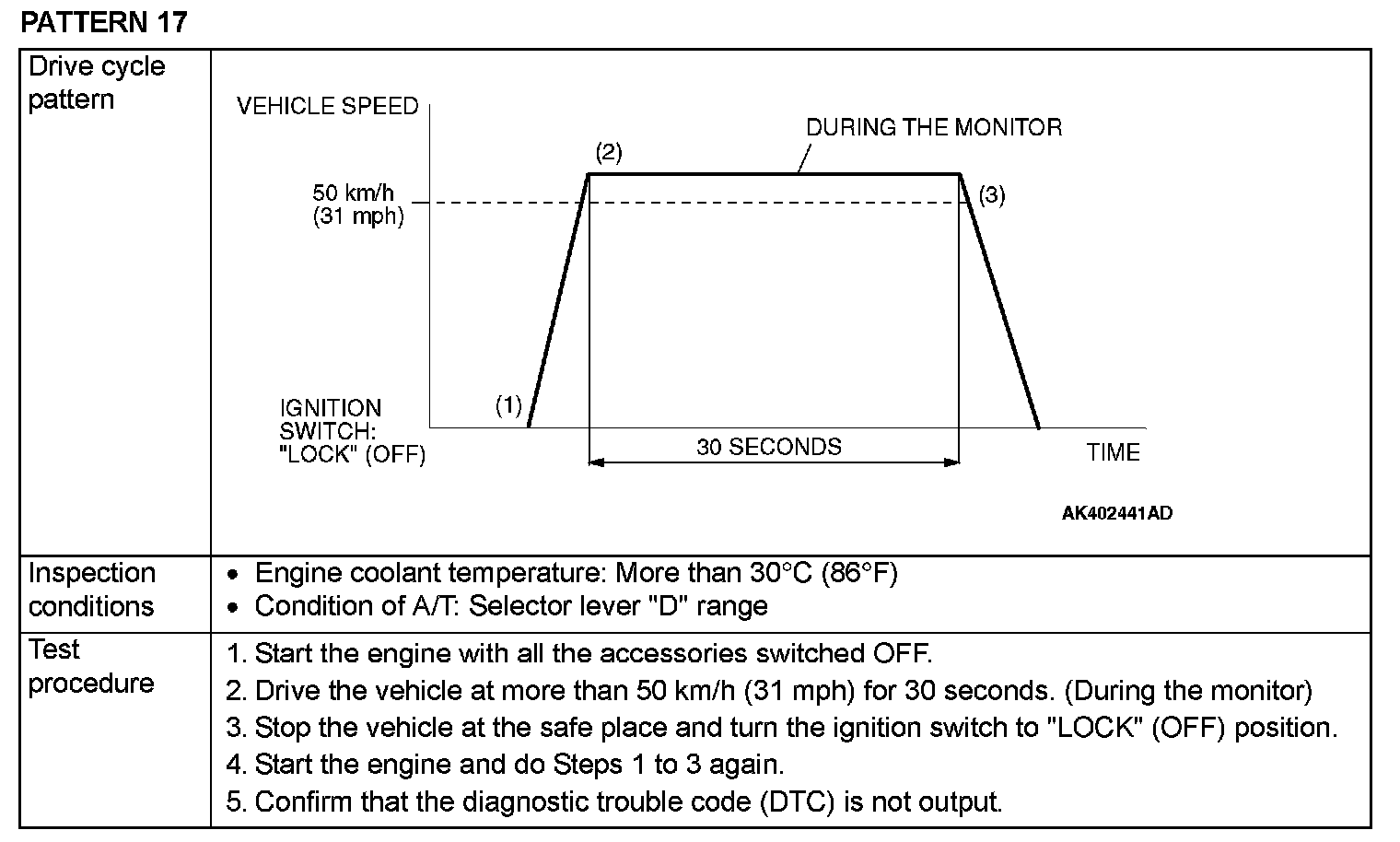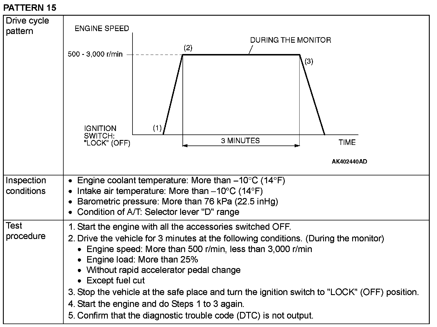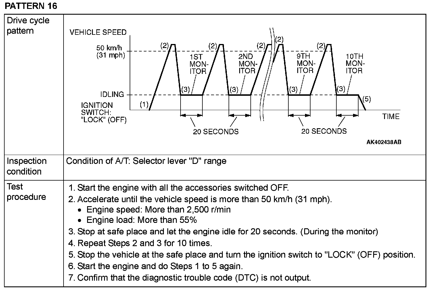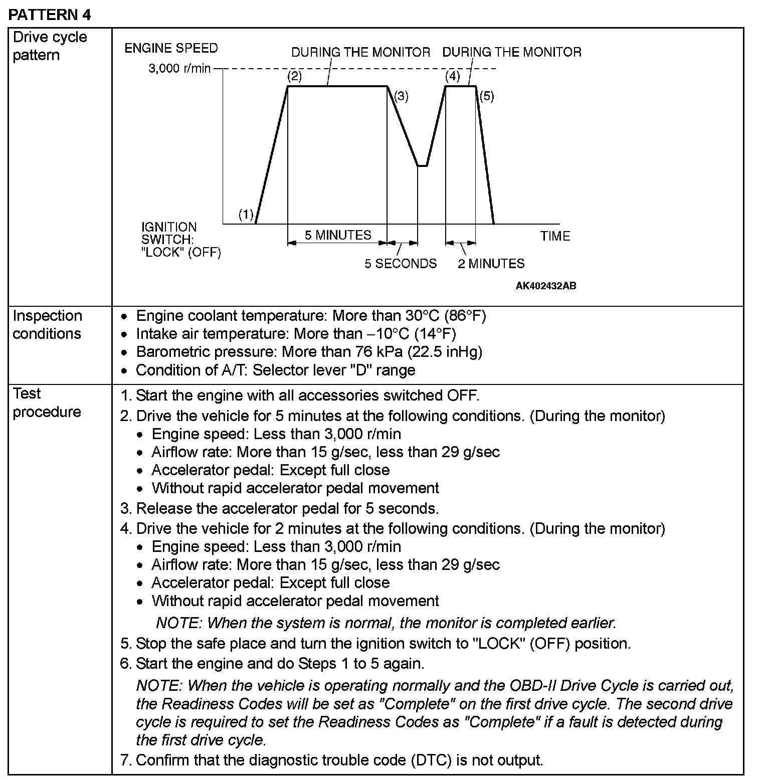 OBD-II DRIVE CYCLEAll kinds of diagnostic trouble codes (DTCs) can be monitored by carrying out a short drive according to the following 23 drive cycle patterns. In other words, doing such a drive regenerates any kind of trouble which involves illuminating the Malfunction Indicator Lamp (SERVICE ENGINE SOON or Check Engine Lamp) and verifies the repair procedure has eliminated [the trouble the Malfunction Indicator Lamp (SERVICE ENGINE SOON or Check Engine Lamp) is no longer illuminated].