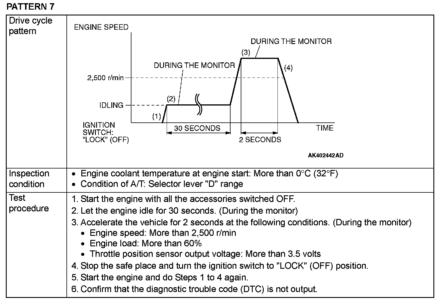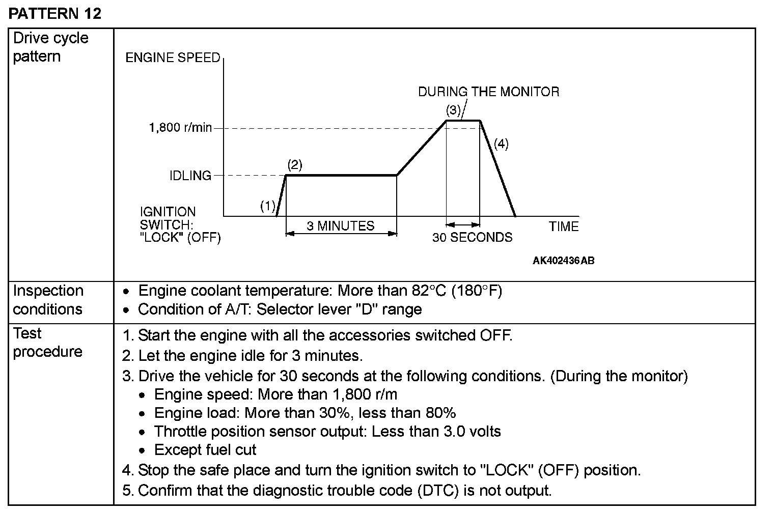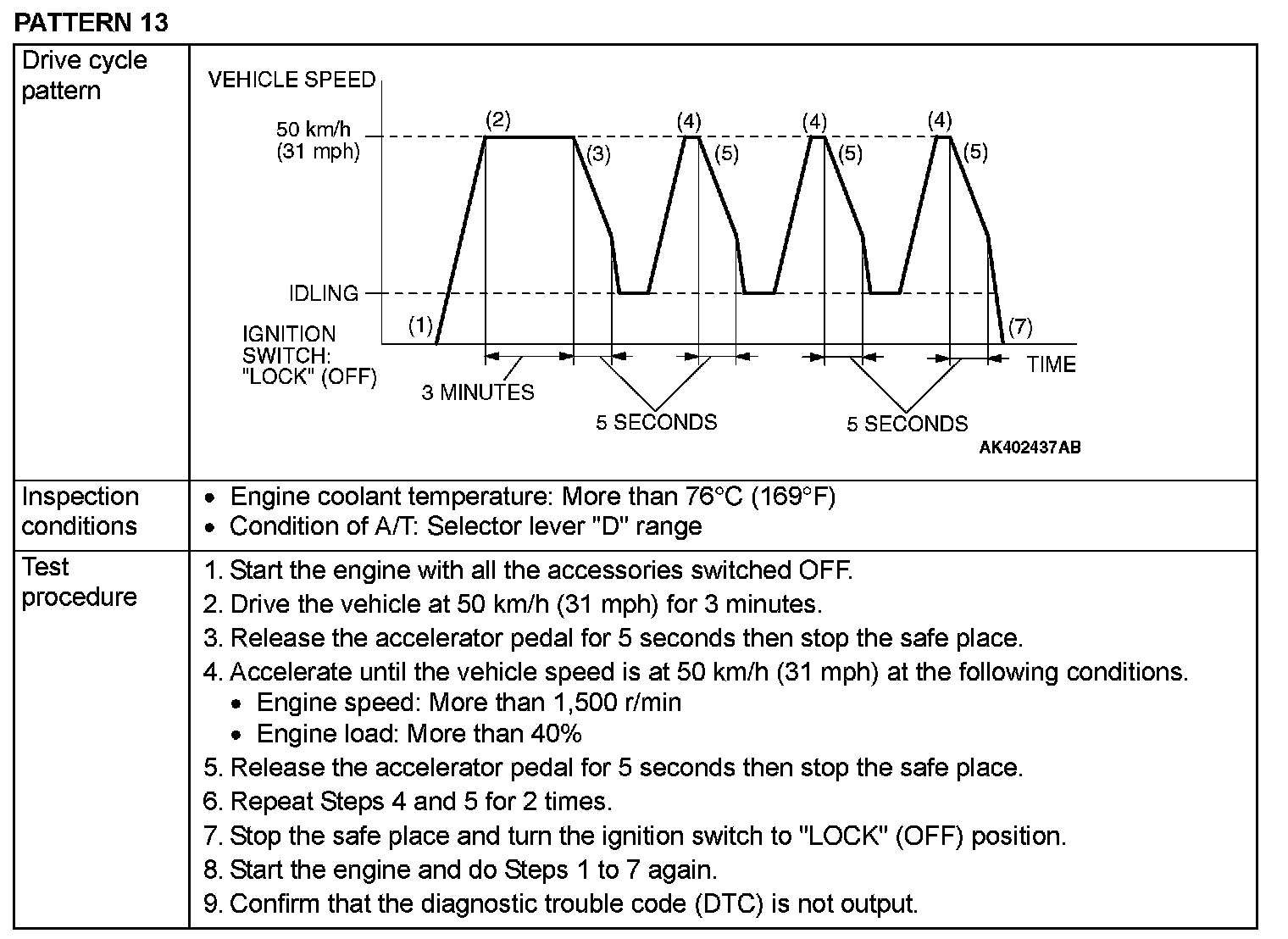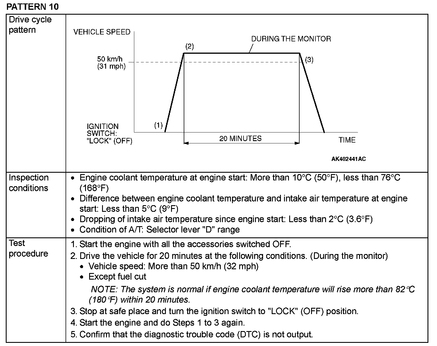 OBD-II DRIVE CYCLEAll kinds of diagnostic trouble codes (DTCs) can be monitored by carrying out a short drive according to the following 23 drive cycle patterns. In other words, doing such a drive regenerates any kind of trouble which involves illuminating the Malfunction Indicator Lamp (SERVICE ENGINE SOON or Check Engine Lamp) and verifies the repair procedure has eliminated [the trouble the Malfunction Indicator Lamp (SERVICE ENGINE SOON or Check Engine Lamp) is no longer illuminated].
