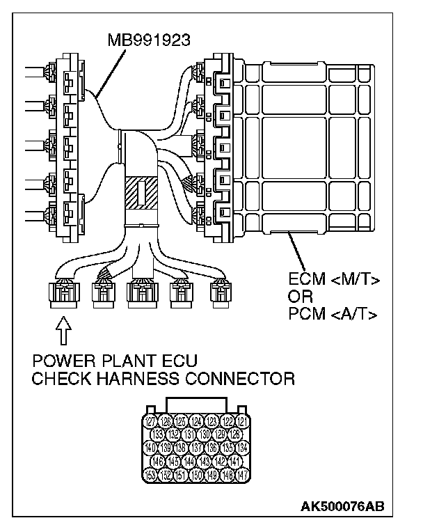 1. Disconnect all ECM [M/T] connectors or PCM [A/T] connectors. Connect the check harness special tool (MB991923) between the separated connectors.