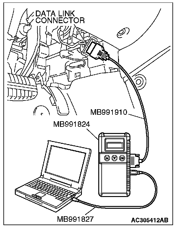 2. Turn the ignition switch to the "LOCK" (OFF) position and connect the scan tool MB991958 to the data link connector.