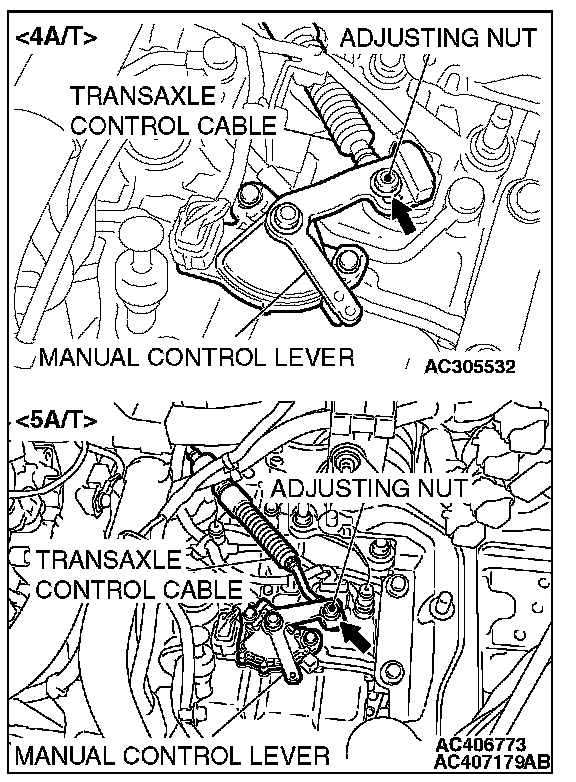 6. Gently push the transaxle control cable in the direction of the arrow, until the cable is taut. Tighten the adjusting nut.