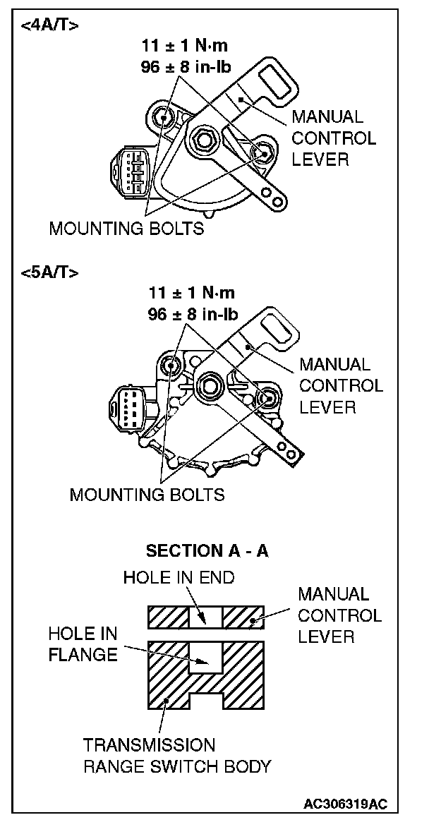 4. Loosen the transmission range switch body mounting bolts and turn the park/neutral position switch body so the hole in the end of the manual control lever and the hole (section A - A in the figure on the left) in the flange of the transmission range switch body flange are aligned.