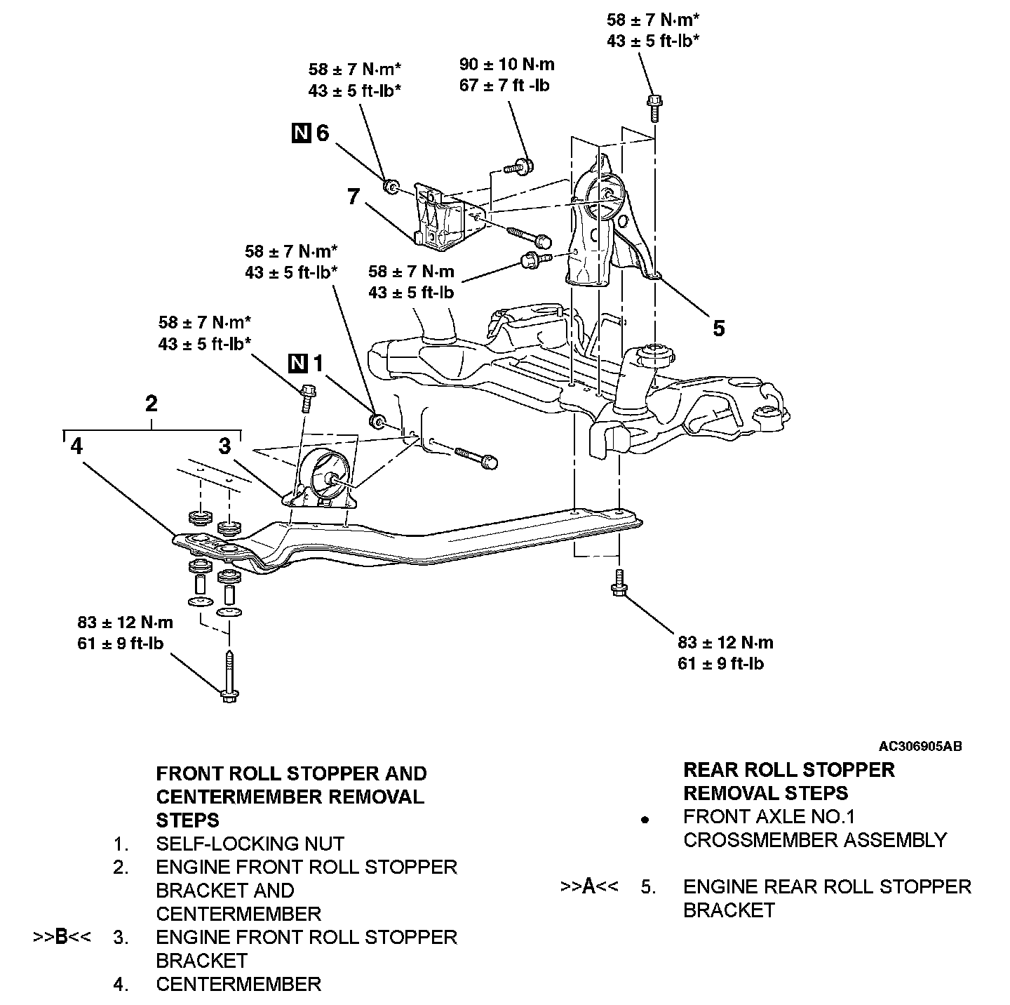 Rear Roll Stopper Bracket Removal Steps 1-7: