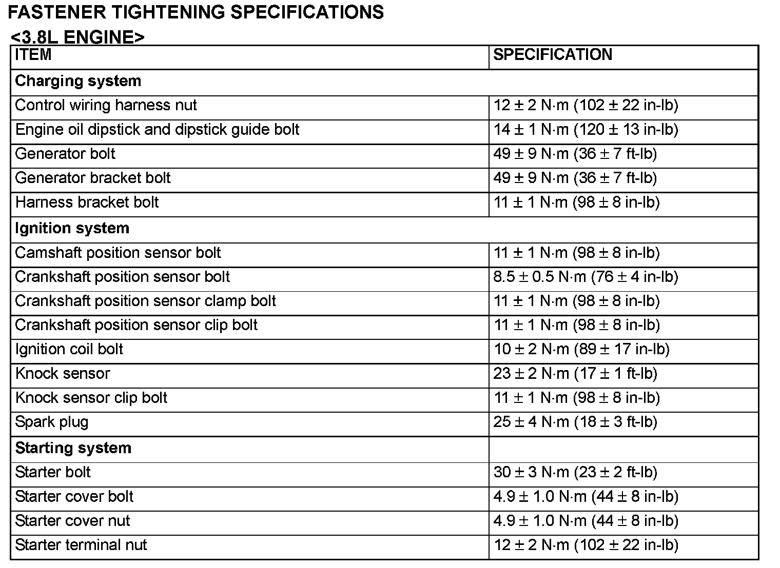 Fastener Tightening Specifications: