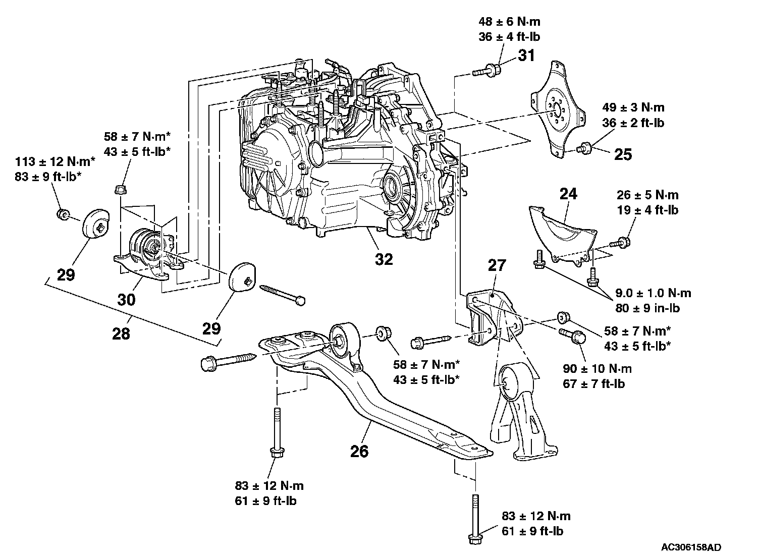 *: Indicates parts which should be temporarily tightened, and then fully tightened after placing the vehicle horizontally and loading the full weight of the engine on the vehicle body.