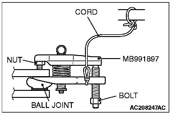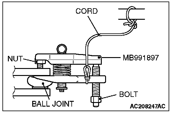 1. Replace the self locking nut with a regular nut, because the original one is a little bit large to install the special tool. Install special tool MB991897 as shown in the figure.