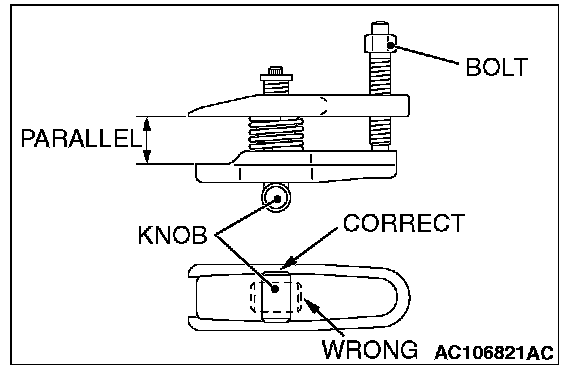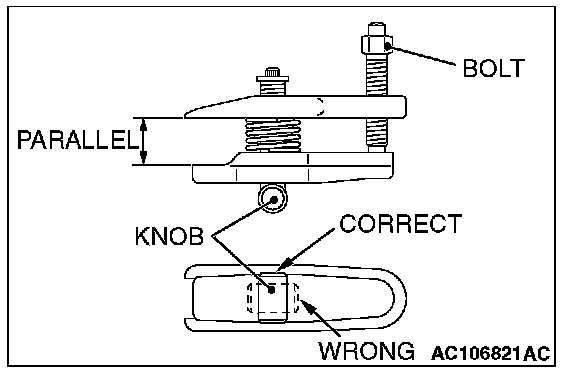 2. Turn the bolt and knob as necessary to make the jaws of special tool MB991897 parallel, tighten the bolt by hand and confirm that the jaws are still parallel.