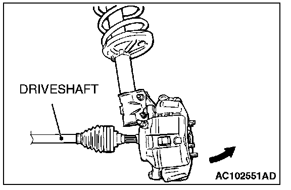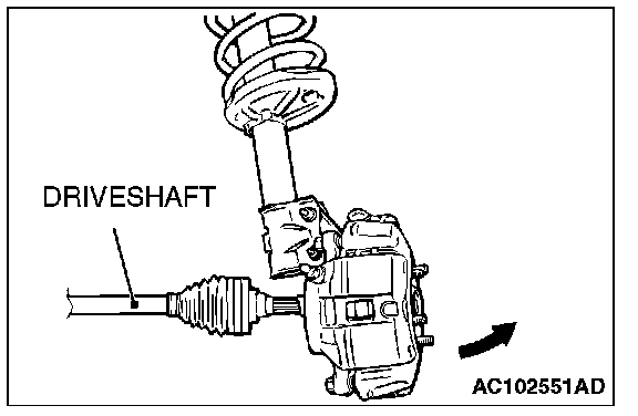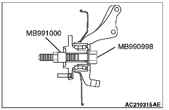 Do not apply pressure to the wheel bearing by the vehicle weight to avoid possible damage when the drive shaft is removed. If, however, vehicle weight must be applied to the bearing to move the vehicle, temporarily secure the wheel bearing by using special tools MB991000 and MB990998.