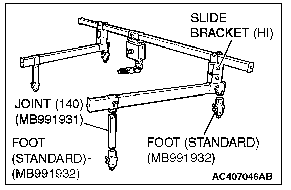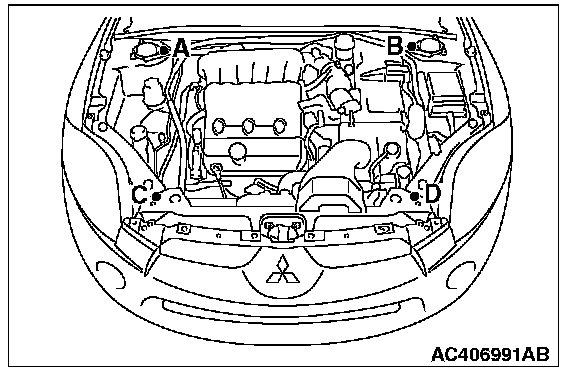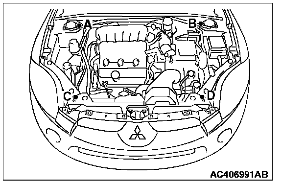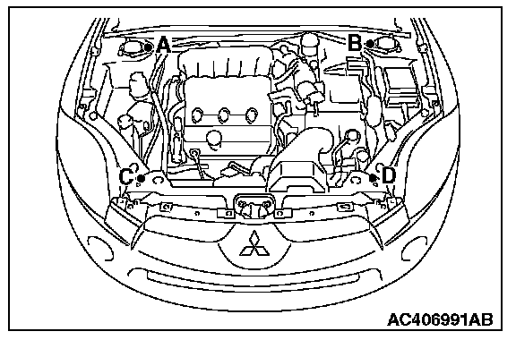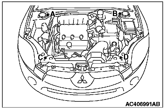 1) Set special tool MB991895 to the front fender mounting bolts (A and B) and the radiator support upper insulator mounting bolts (C and D), which are located in the engine compartment, as shown.
