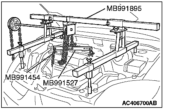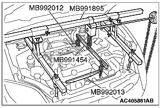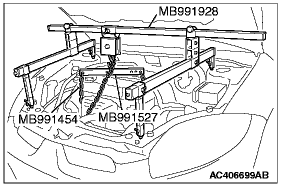 2) Set special tool MB991527 and MB991454 (chain) to hold the engine/transaxle assembly.
