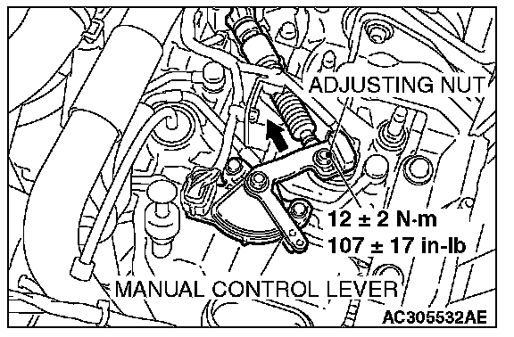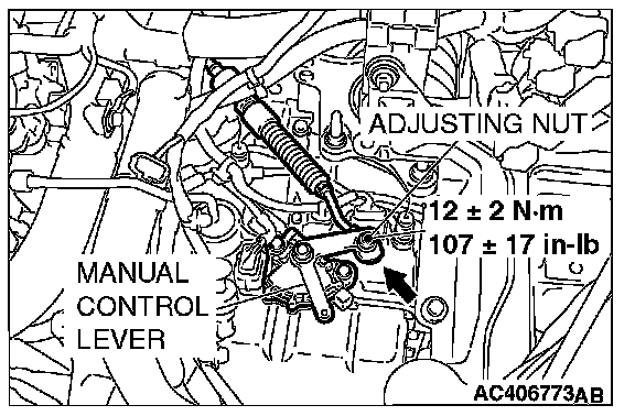 2. Place the cable stud into the manual control lever slot and install the nut loosely. Gently push the transaxle control cable into the manual control lever slot until the cable is taut. Tighten the nut to the specified torque.