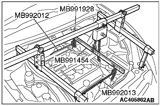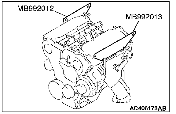 2. After removing the intake manifold plenum stay (rear) and the engine hanger, set special tool MB992012 and MB992013 to each cylinder head.