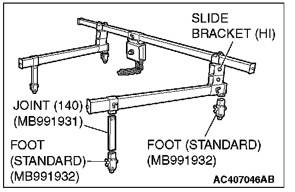 1) Assemble the engine hanger (special tool MB991928). Set following parts to the base hanger.