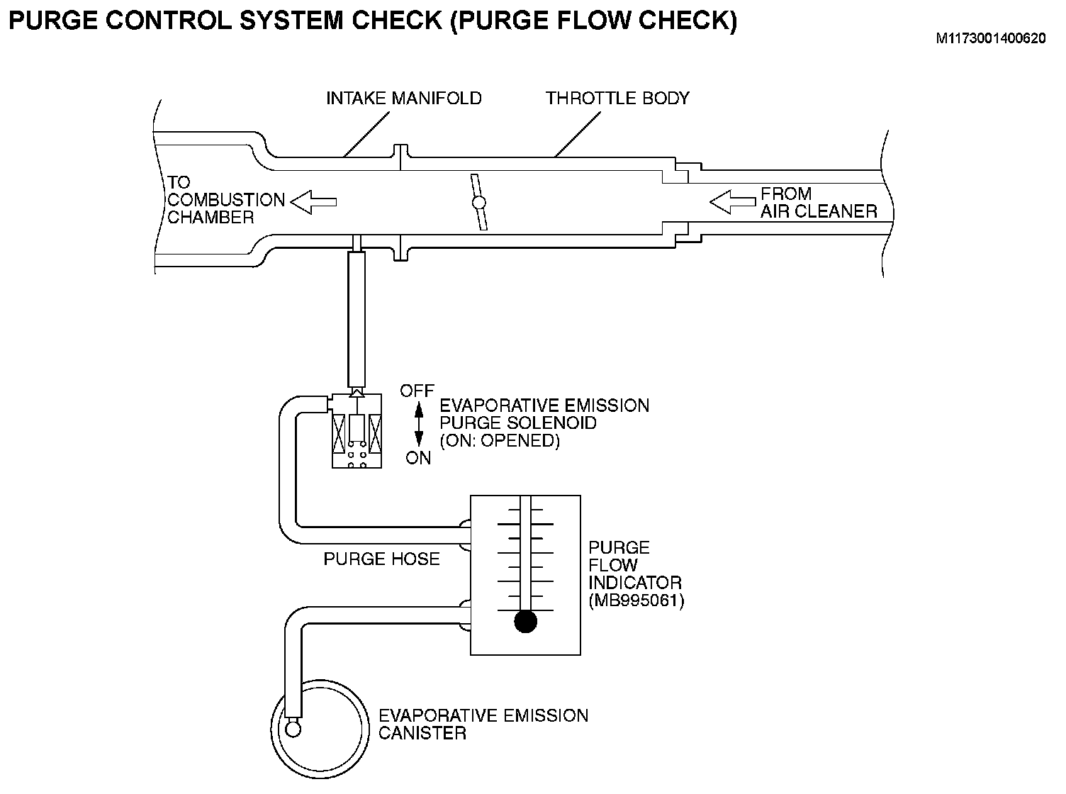 1. Disconnect the purge hose from the evaporative emission (EVAP) purge solenoid, and connect special tool MB995061 between the EVAP purge solenoid and the purge hose.