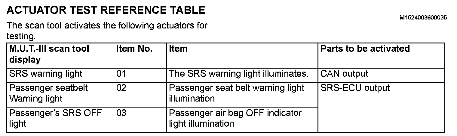 Actuator Test Reference Table: